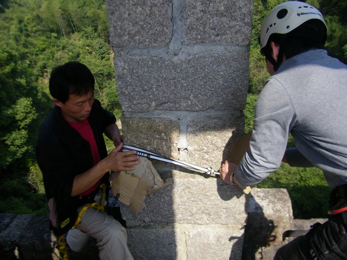 大万带领大家把头盔、主绳、8字环、主锁、安全带、菊绳、长扁带等技术装备一一拿出来,在桥的护栏上做好防磨保护,建立保护站,向队友讲解操作步骤和注意事项。又详细的讲解了一番动作要领,今天的桥降开始了,我负责拍照,一描下面,好高,有七八楼那么高吧,有点紧张和兴奋,兄弟们下降前,都会在大万的注视下从穿绳等步骤做起,每一个步骤都非常清晰。看着兄弟们一个个下降,狂按快门,轮到我下了,虽然之前有过一次岩降经历,,当脚跨出去整个人吊在半空中说不紧张是不可能的,大万帮我放掉保护绳扣,起初几米有桥壁可以碰,到后面就整个悬空了,虽然悬在半空中,但第一下过后其他就放轻松了,绳子放的有点块,下降到下面都有点烫手,我下到后面,轮到我拉绳做保护,之前的队友就跑上桥去接着下降,后来又训练了双绳下降,这样有人降了两次有人降了三次,大家都练的很认真很仔细,17点多我整理好装备就下山了